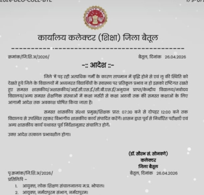 जिले में पड़ रही अत्यधिक गर्मी के कारण तापमान में वृद्धि होने से एवं लू की स्थिति को देखते हुये जिले के विद्यालयों में अध्यनरत विद्यार्थियों के स्वास्थ्य पर प्रतिकूल प्रभाव न हो इसको दृष्टिगत रखते हुए समस्त शासकीय/अशासकीय/आई.सी.एस.ई./सी.बी.एस.ई/अनुदान प्राप्त/केन्द्रीय विद्यालय/नवोदय विद्यालय/अन्य समस्त शैक्षणिक संस्थाओं में कक्षा नर्सरी से कक्षा आठवी तक की समस्त कक्षाओं के लिए आगामी आदेश तक अवकाश घोषित किया जाता हैं।